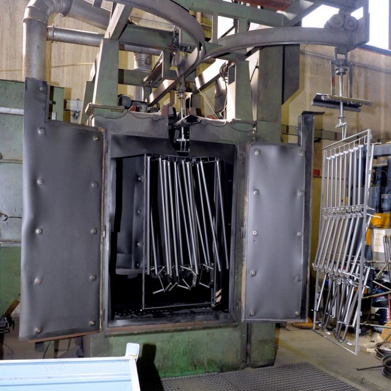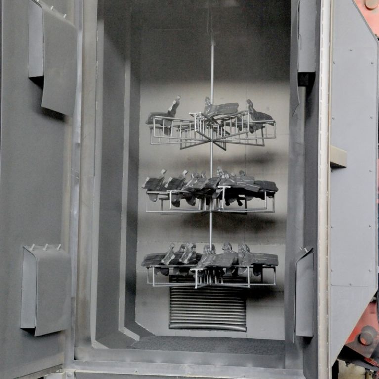 Le fasi del ciclo sono controllate da temporizzatori asserviti da Plc. Durante il ciclo di trattamento, il carrello ‘porta-pezzi’ è mantenuto in costante movimento ‘avanti/indietro’ per aumentare il potere detergente della miscela di fosfosgrassaggio lanciata dalle rampe di spruzzatura nelle diverse fasi del lavaggio. L’asciugatura finale avviene mediante il soffiaggio di aria calda a 140° C, in forno in linea.